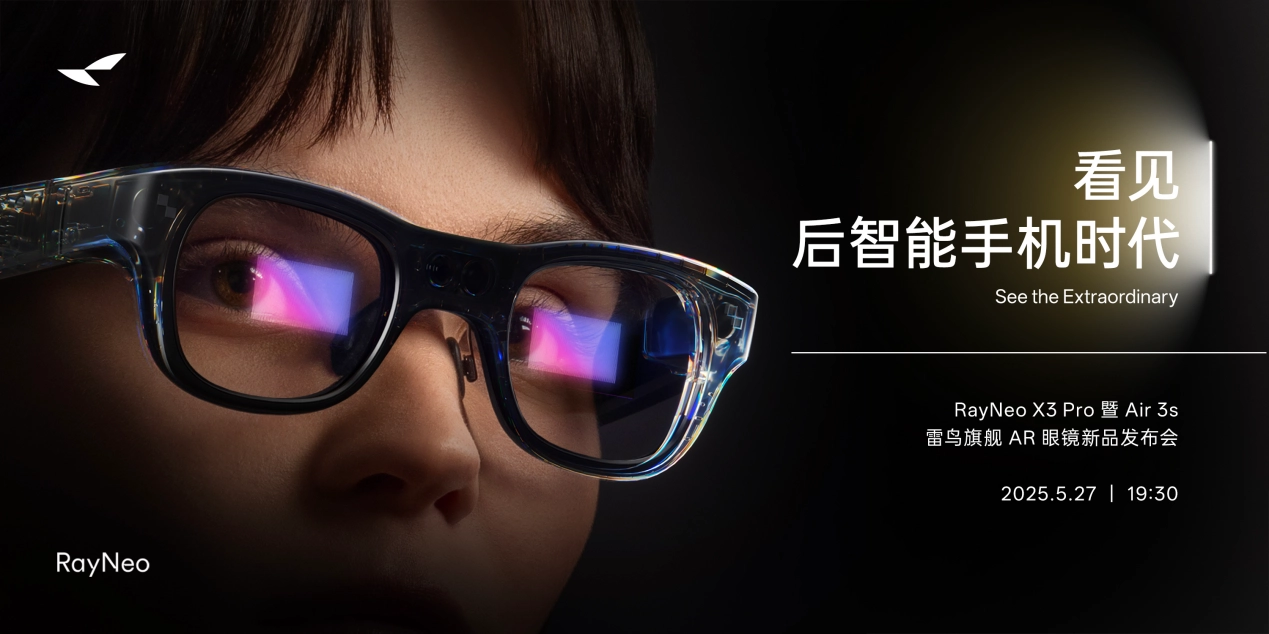 国内市场经过第一季度的技术积累,也将迎来多款新品上市,眼镜市场鼓声不断。官方信息显示,5 月 27 日 19:30,雷鸟创新将正式发布全彩 MicroLED AR 眼镜雷鸟 X3 Pro。